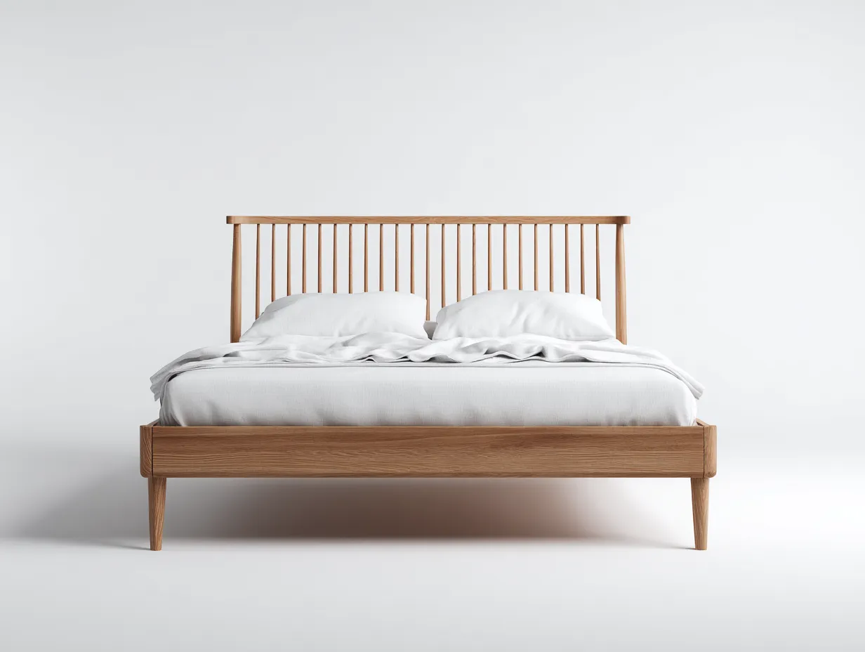 Die Oberfläche zeigt sich in einer warmen Naturholzoptik und unterstreicht den freundlichen, wohnlichen Charakter des Bettes. Das Kopfteil ist mit einer regelmäßigen vertikalen Stabstruktur gestaltet, die dem Modell eine luftige und zugleich dekorative Wirkung verleiht. Der Bettrahmen greift die ruhige Holzoptik harmonisch auf und wird durch leicht ausgestellte Füße ergänzt, die dem Möbelstück eine moderne und leichte Gesamtwirkung geben. Die saubere Verarbeitung, die klaren Kanten und die ausgewogenen Übergänge machen dieses Modell zu einer passenden Wahl für Schlafzimmer, in denen Natürlichkeit und modernes Design gefragt sind.